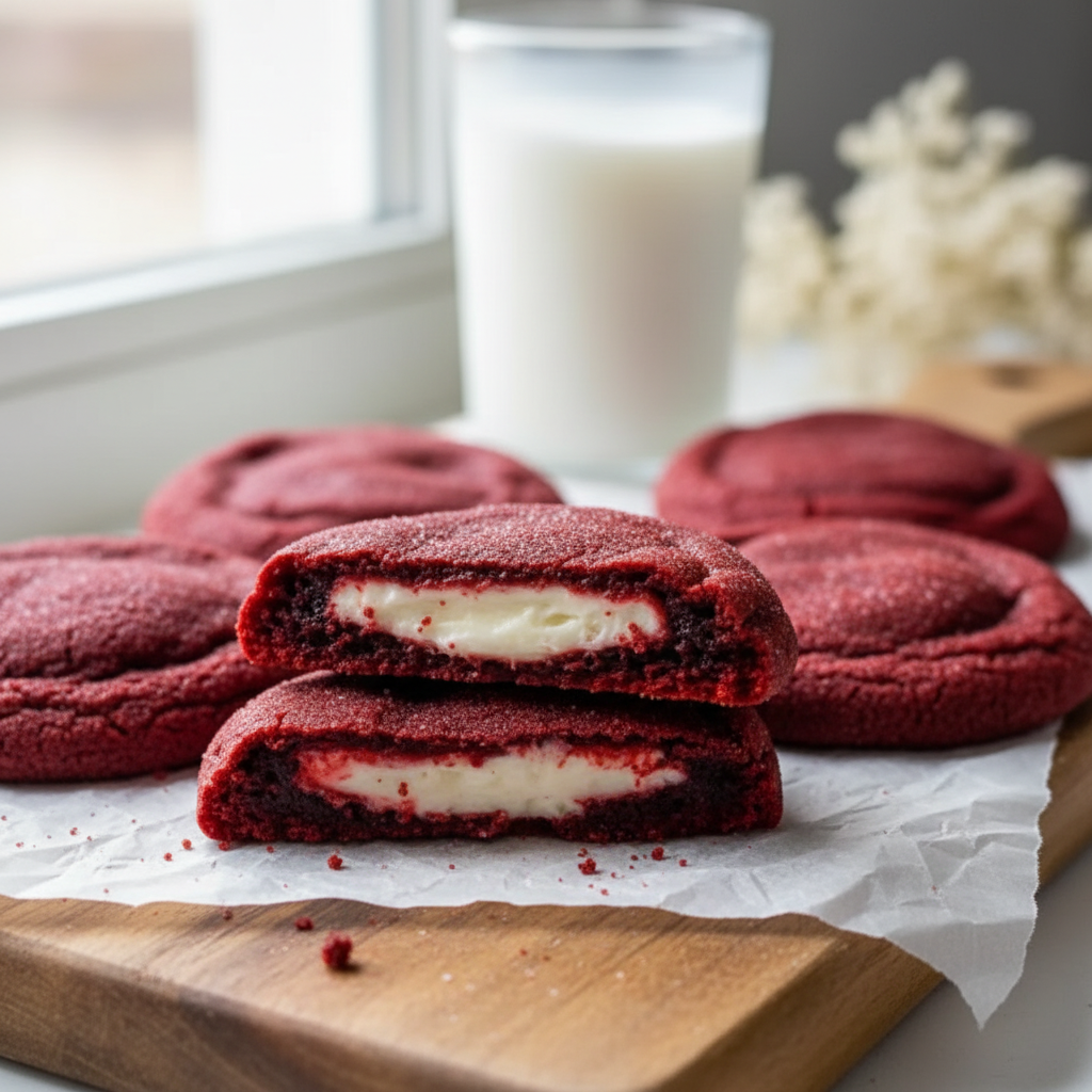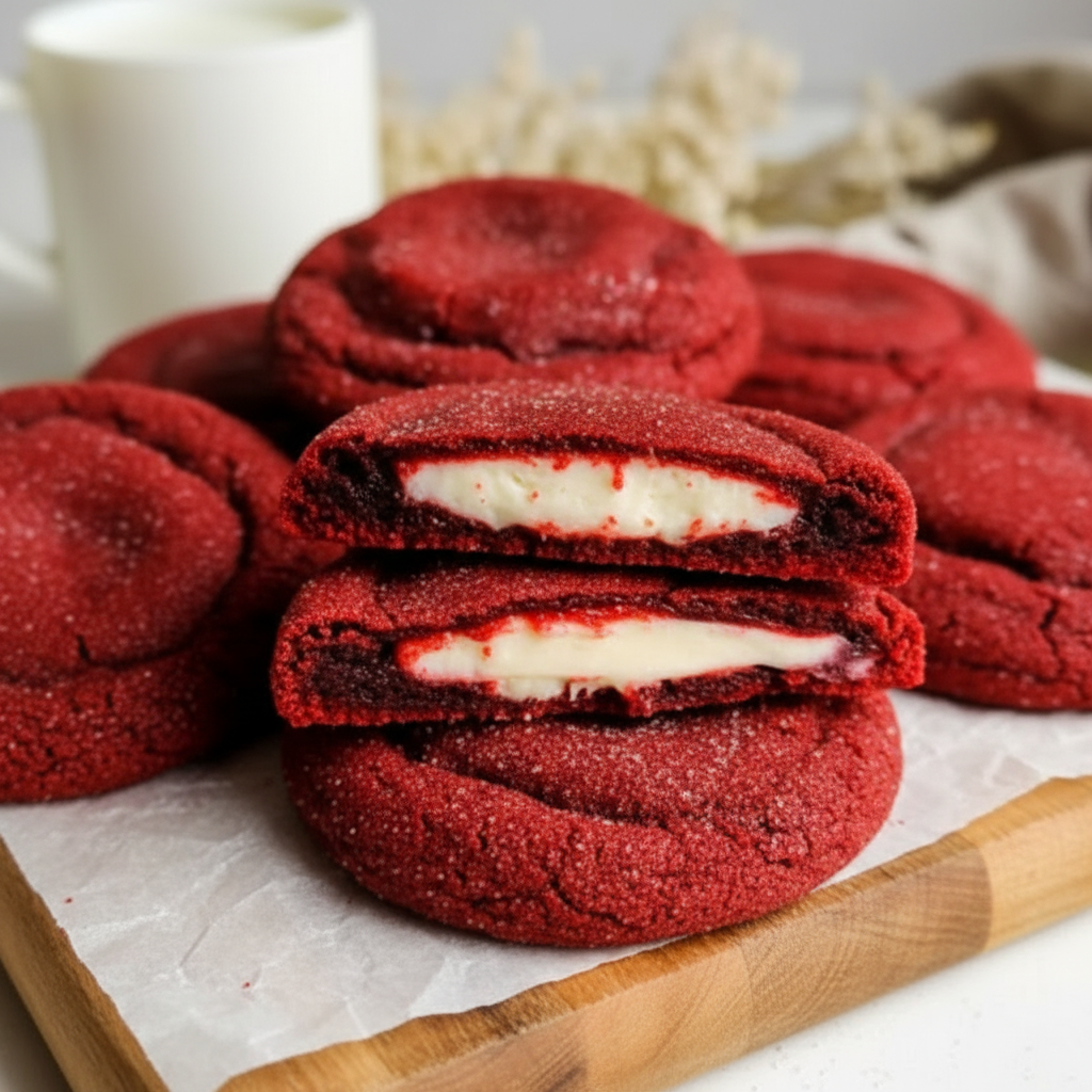 What makes these cookies stand out is the luscious cheesecake filling baked right inside, giving each cookie a surprise center that contrasts delightfully with the tender, cocoa-infused red velvet dough. Whether you’re baking for a special occasion or just craving a fun, decadent dessert, these cookies bring festive flair and sophisticated flavor to your cookie jar.